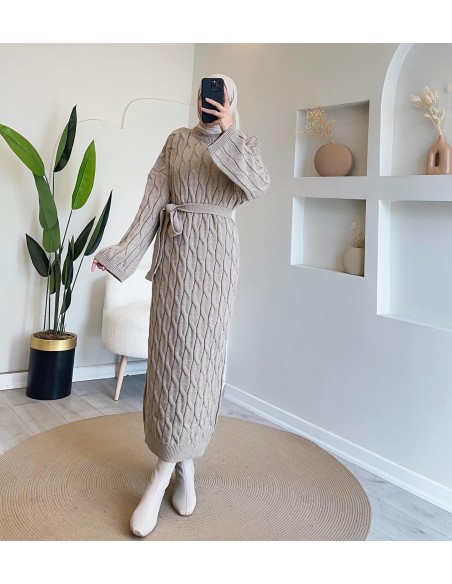 Saç örgülü, kapalı yaka, düşük omuz, seyyar triko kemerli, etek ucu lastik örgü, yumuşak dokulu, rahat kalıp triko elbise.