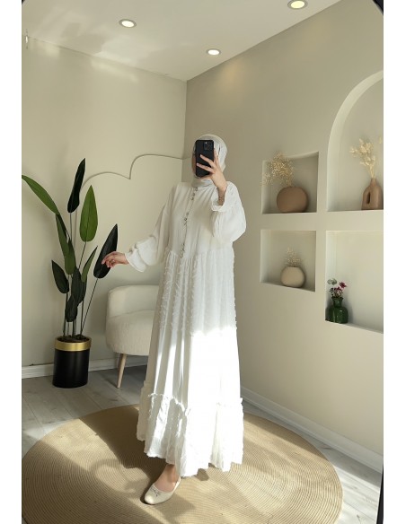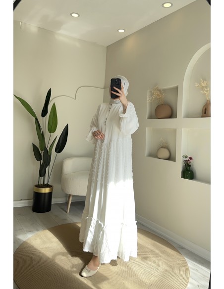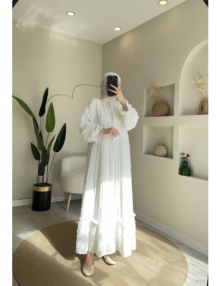 8045 Taş Düğmeli Alaçatı Elbise Beyaz