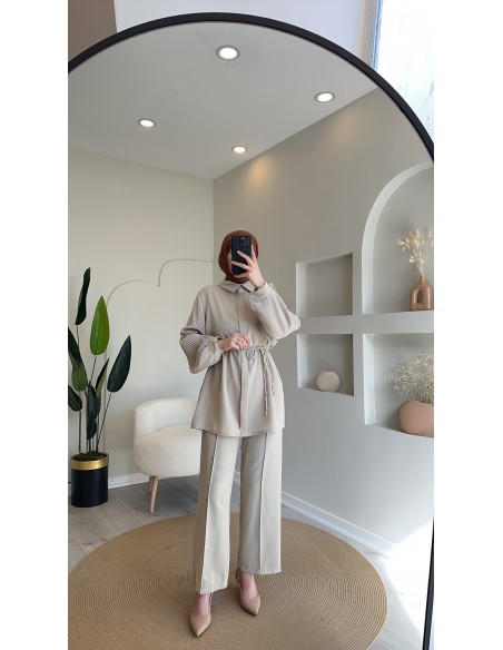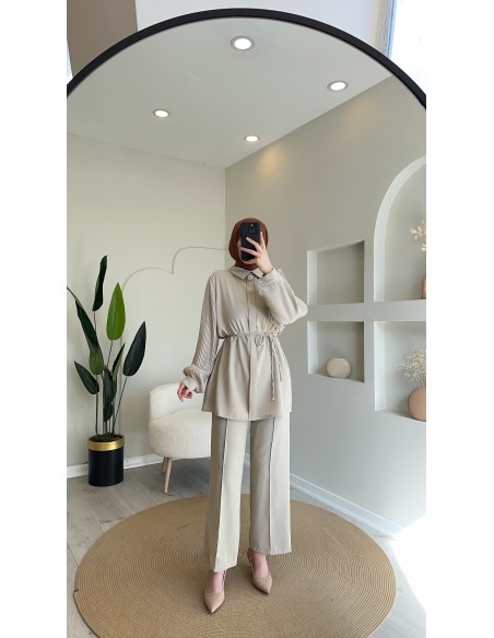 Krep kumaştan üretilen pantolon takımımızın pantolon beli lastikli tam kalıptır üst tunik yakası taş broşludur beli ince kemerlidir kemersizde kullanabilirsiniz kendi bedeninizi tercih edebilirsiniz