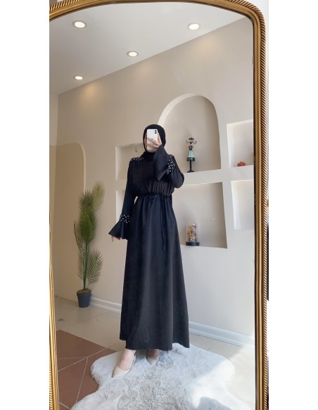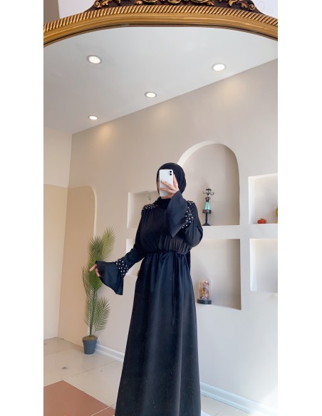 Saten kumaş tam boy elbisemiz kolu ve yakası inci detaylıdır beli ince kuşaklıdır tam kalıptır kendi bedeninizi tercih edebilirsiniz