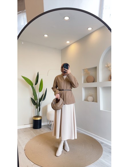 HK25141 kontrast deri kemerli ceket...