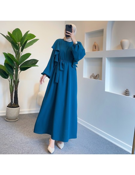 0040 omuz fırfır detay elbise - petrol mavi