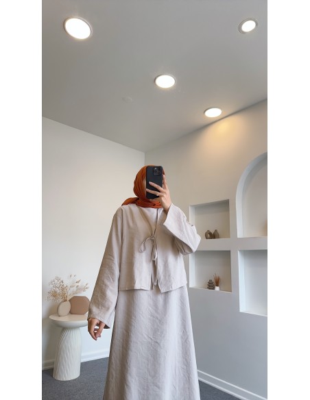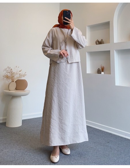 Bisiklet yakalı, arkadan fermuarlı, sıfır kollu, rahat kalıp, hırkalı bağlama detaylı, geniş kollu astarsız hırkalı elbise takım.