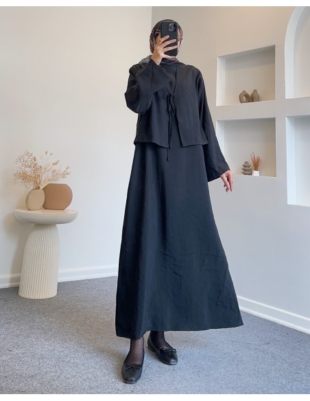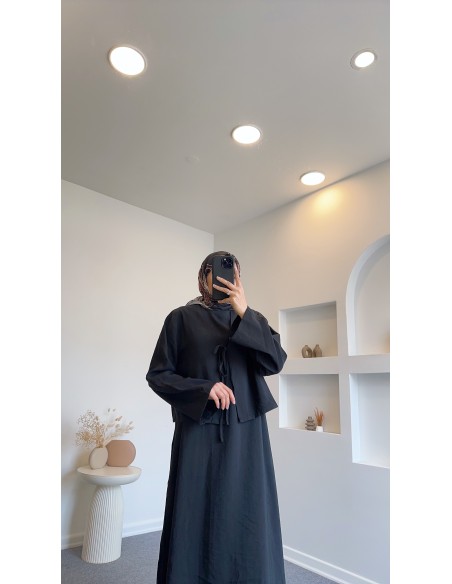 Bisiklet yakalı, arkadan fermuarlı, sıfır kollu, rahat kalıp, hırkalı bağlama detaylı, geniş kollu astarsız hırkalı elbise takım.