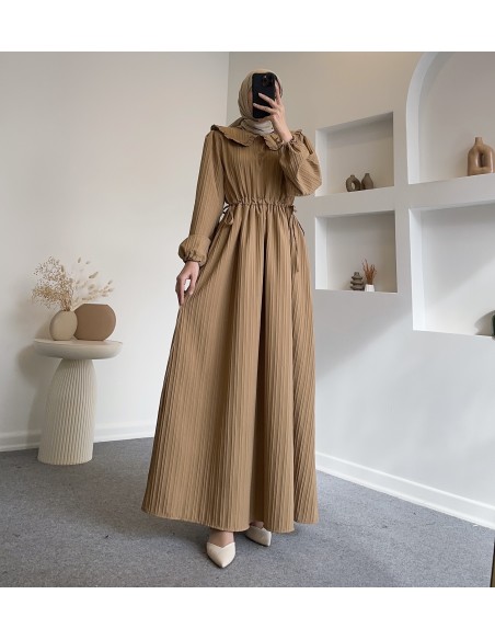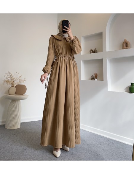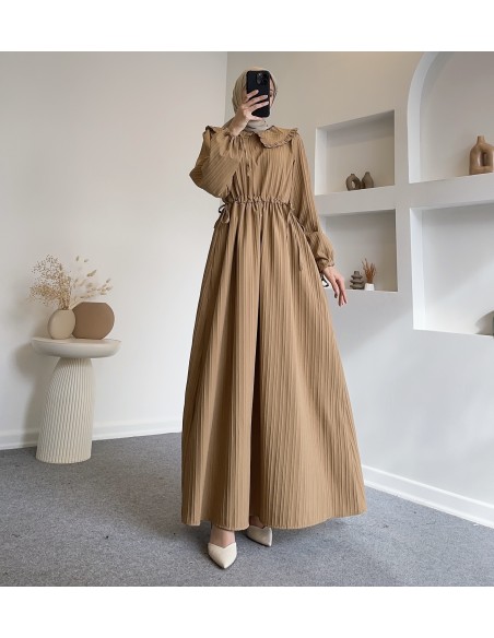 25Y9123 yaka detay bel büzgülü elbise - camel