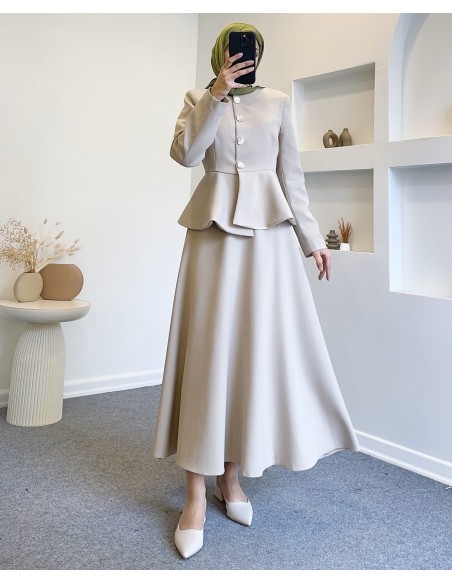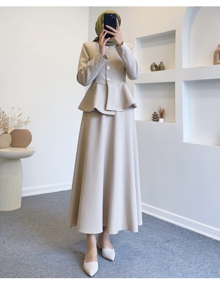 Etek ; yandan fermuarlı, bel kısmı kemerli, kloş kesimdir.
