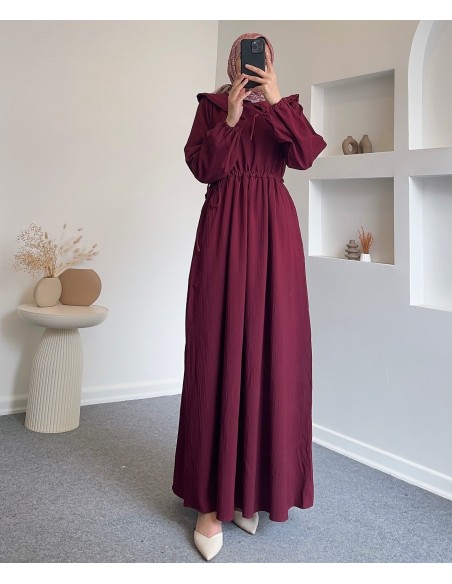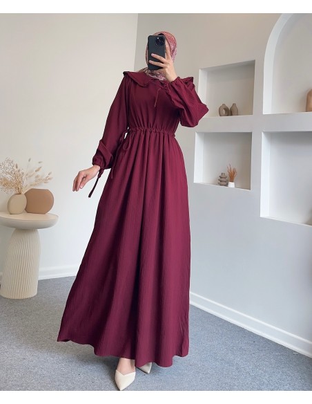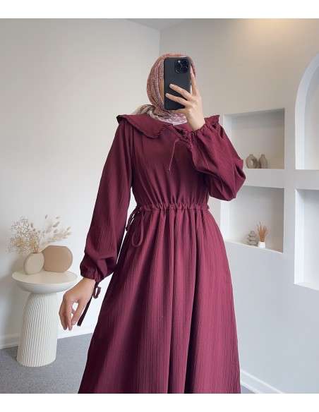 25Y9123 yaka detay bel büzgülü elbise - bordo