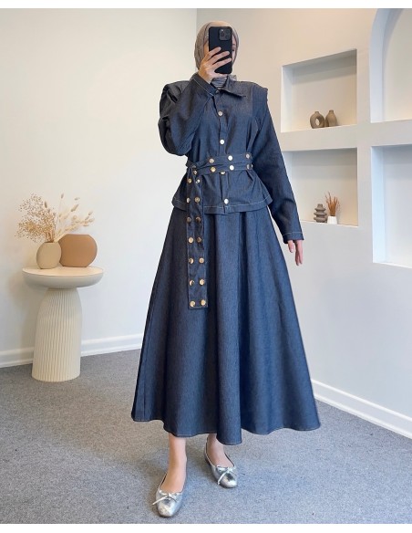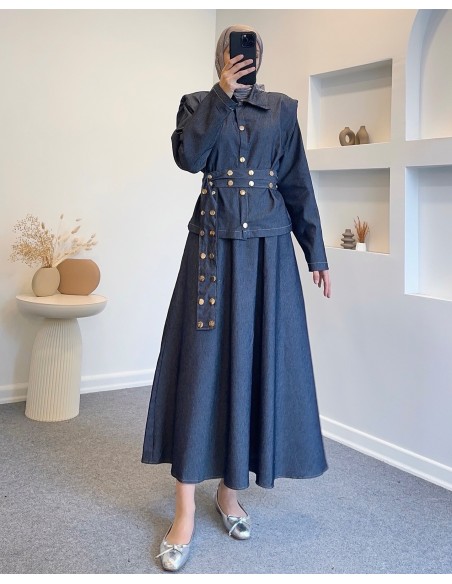 Etek :Beli lastikli , kloş kesime sahip kot etek .Üst : Klasik yaka , önden çıt çıt düğmeli , omuzdan vatkalı , çıt çıt düğmeli gömlek .