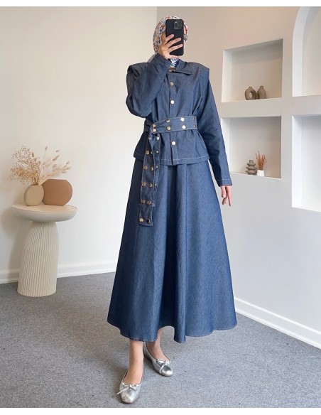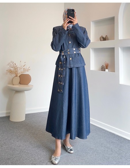 Etek :Beli lastikli , kloş kesime sahip kot etek .Üst : Klasik yaka , önden çıt çıt düğmeli , omuzdan vatkalı , çıt çıt düğmeli gömlek .