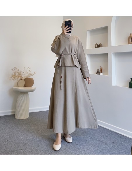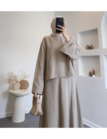 Mevsim geçişlerine ve yaz aylarına özel olarak tasarlanan bu zarif takım, sade şıklığı ve konforu bir arada sunuyor. Seyyar kemeriyle vücut tipinize göre ayarlanabilir form kazanan üst parça, geniş kesimli etekle tamamlanıyor. Doğal dokusu ve hafif kumaşı sayesinde gün boyu rahatlık sağlar.