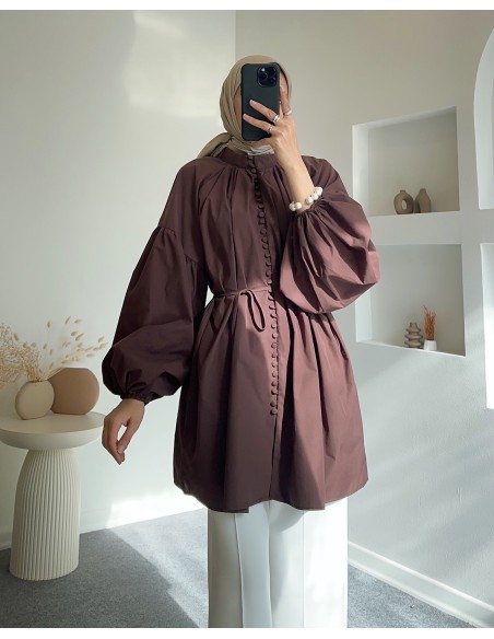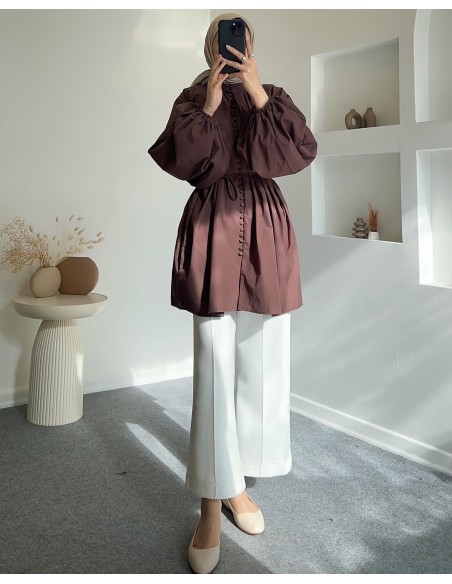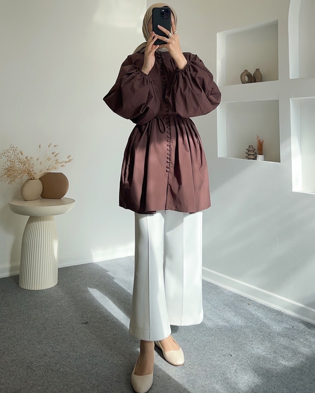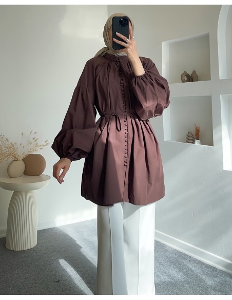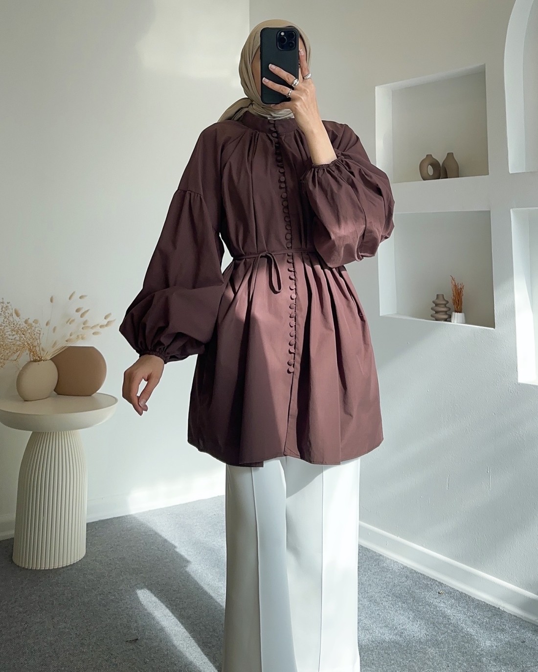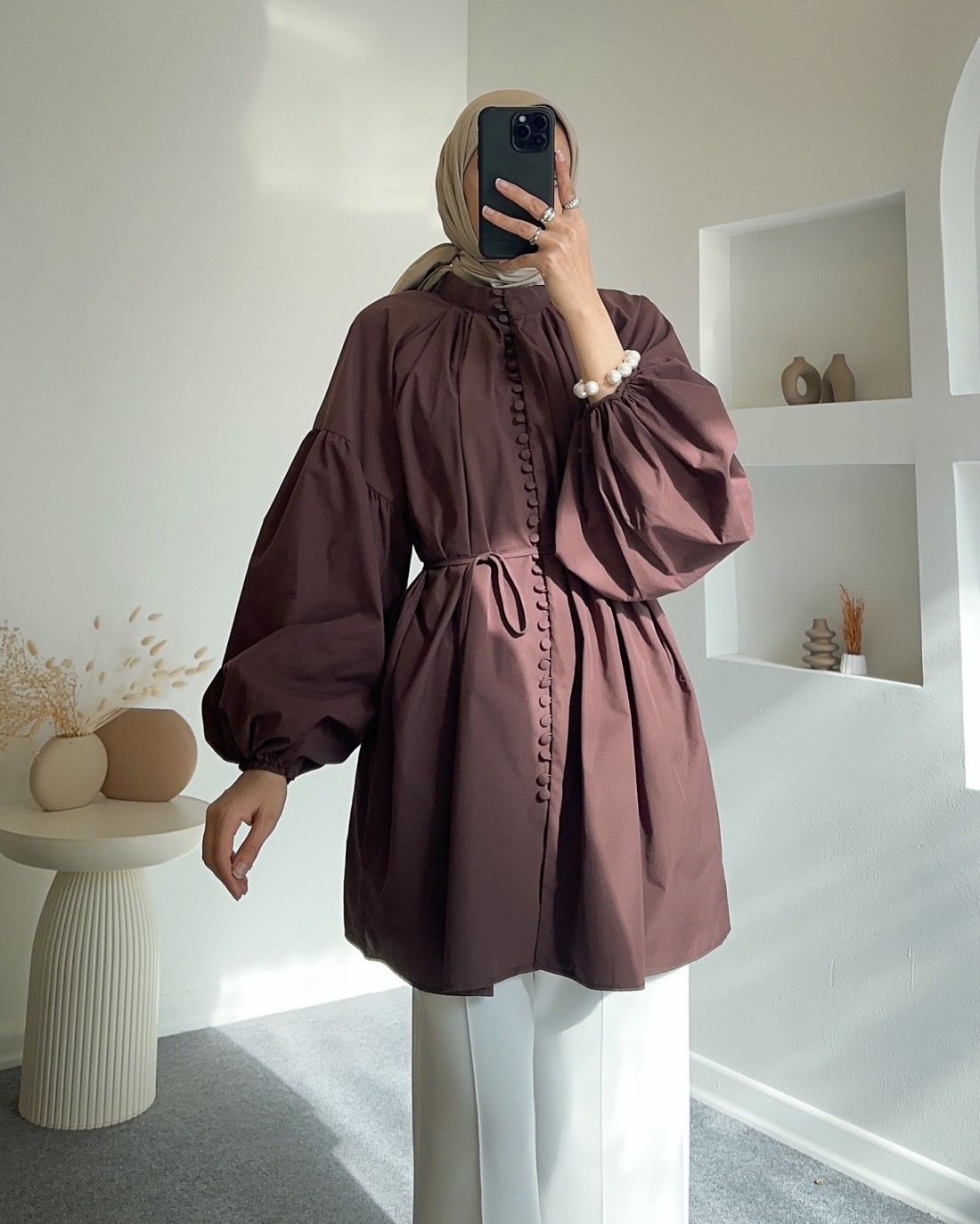 HY24311 düğmeli poplin gömlek- Çikolata kahve