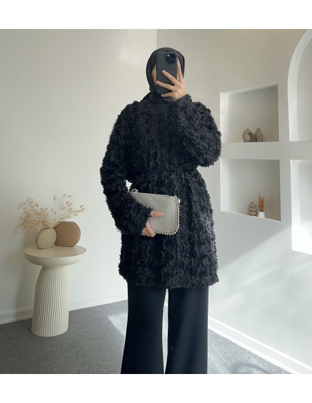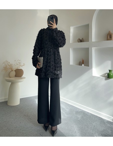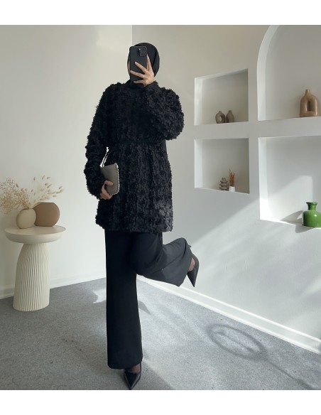 - Üst: Kabarık, dokulu kumaşa sahip siyah tunik. Belden ince bir kemerle hafifçe toparlanmış. Dokusu çiçekli veya kabartmalı bir yüzeye sahip, bu da parçaya hem zarif hem de hacimli bir görünüm kazandırıyor.