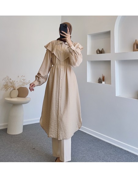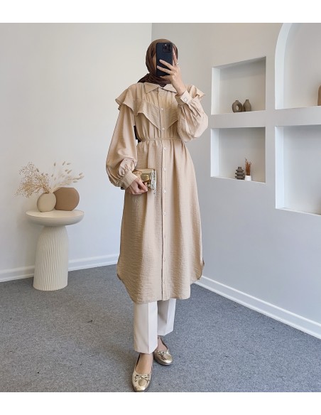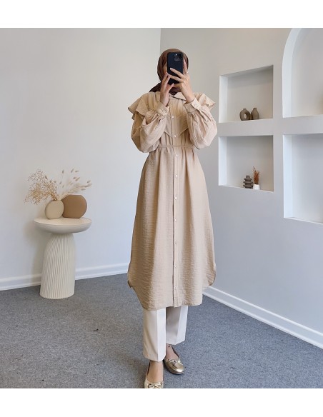 7776 asimetrik parçalı pamuklu tunik- Bej