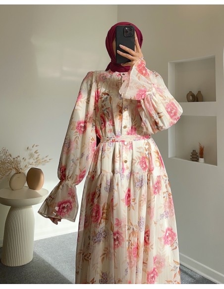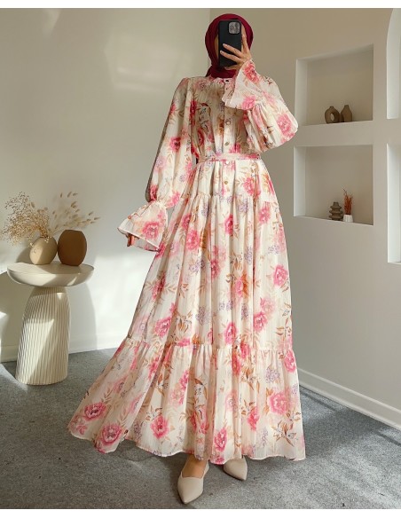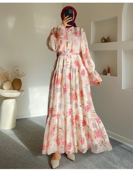 Şifon kumaştır. Elbise boy; 140 cm içi tam boy astarlı ön kısmı düğmelidir