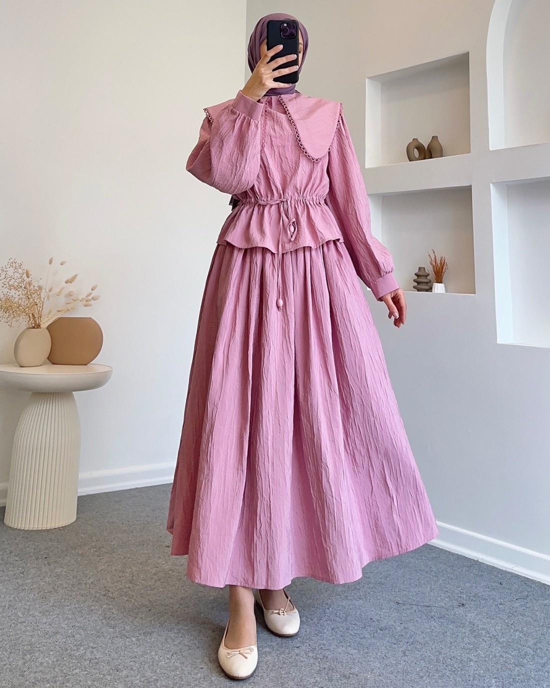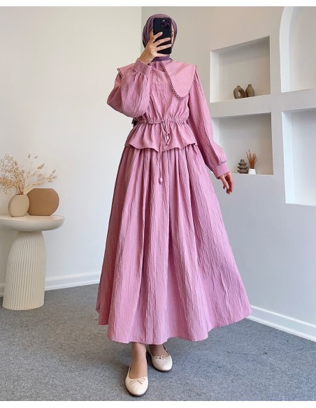 Bel kısmı sıkmalı büzgülü etek içi astarlıdır. Etek boy 93 cm üst boy 75 cm
