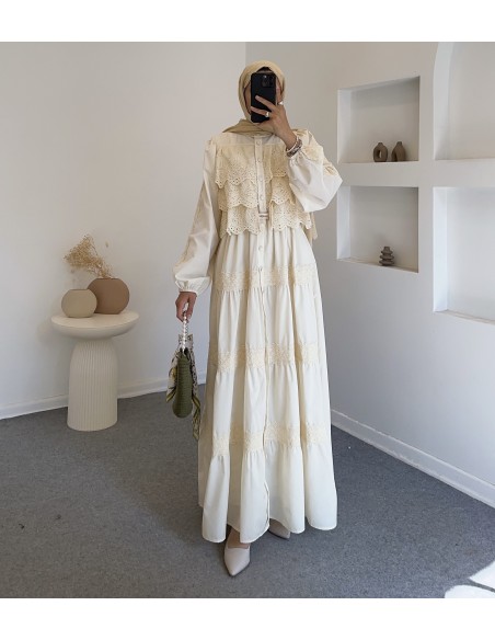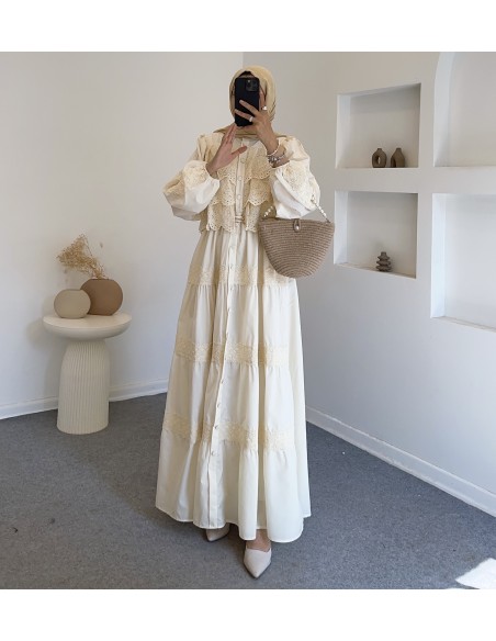 Özellikleri: Elbisemizin ön kısmı dantel güpür detaylı, beli lastikli, bel kısmına kadar düğmeli olup belden aşağısı süs düğme detaylı