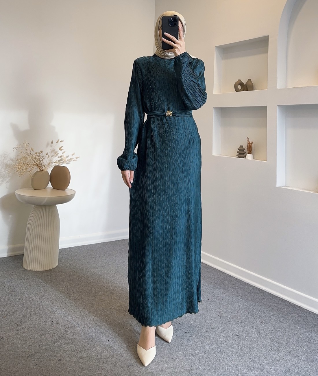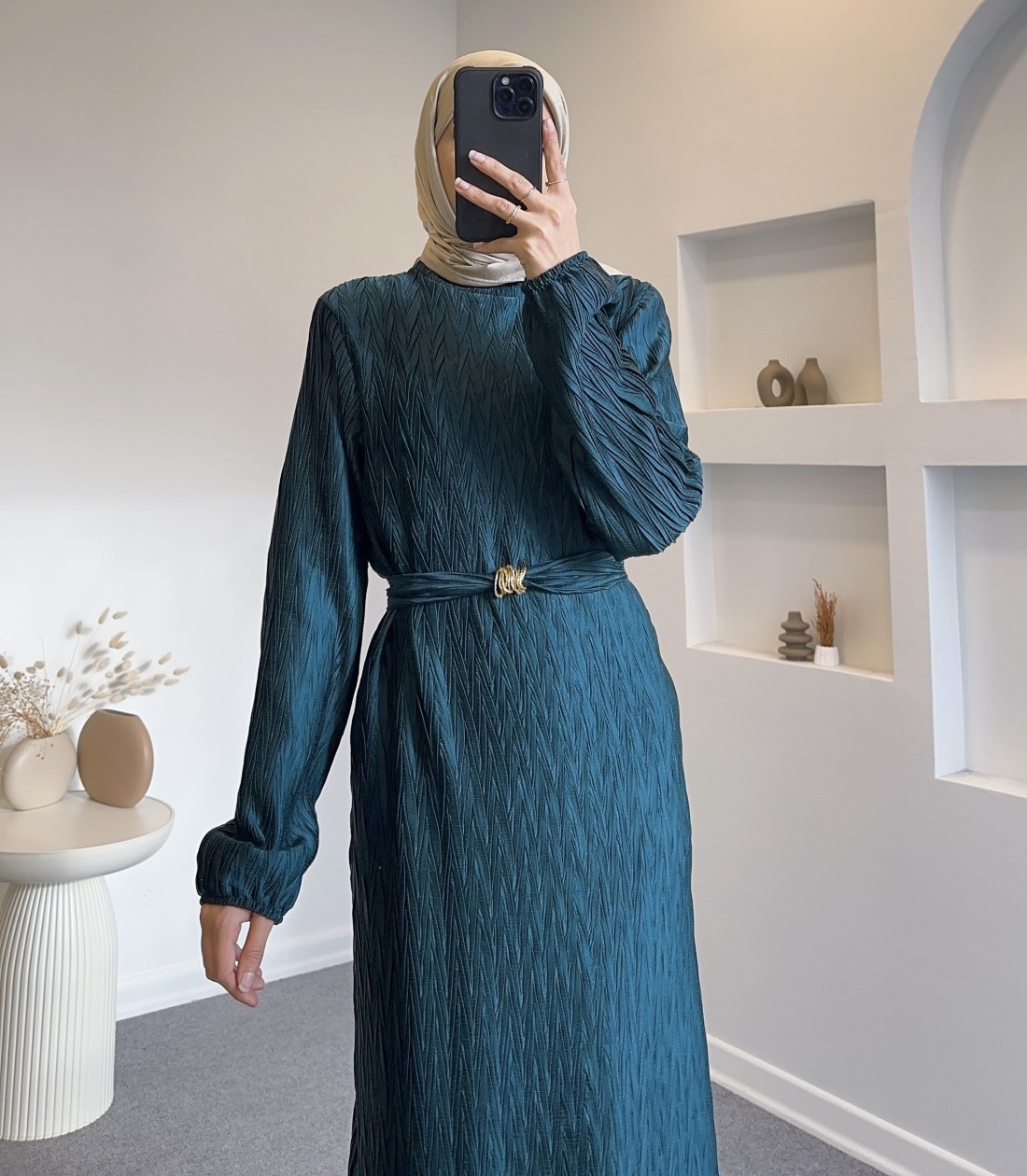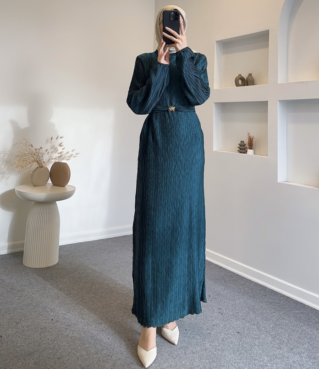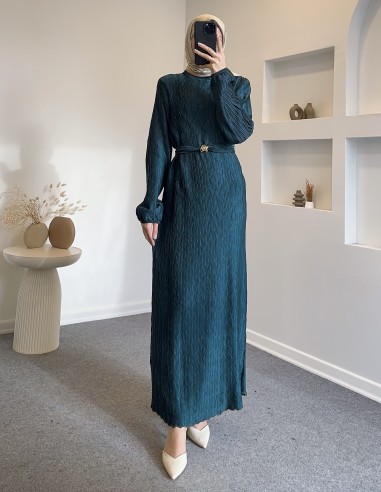 6070 kemer detay elbise - turkuaz