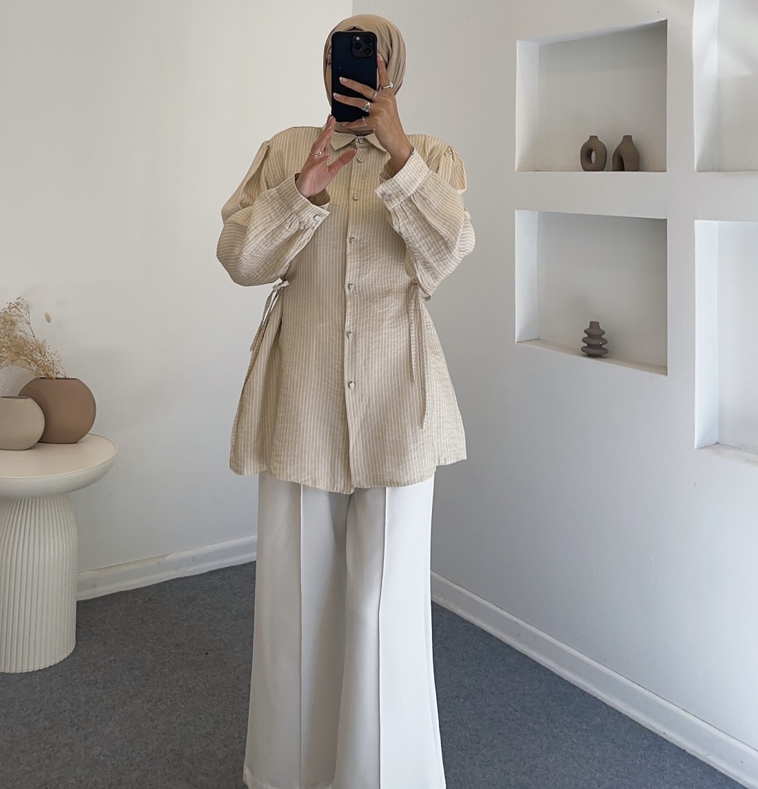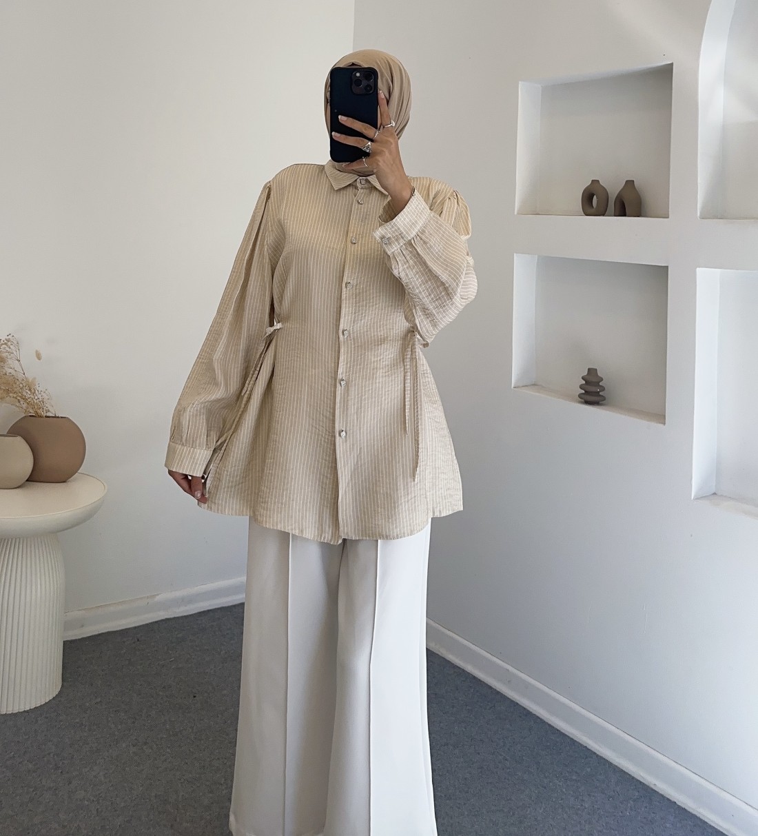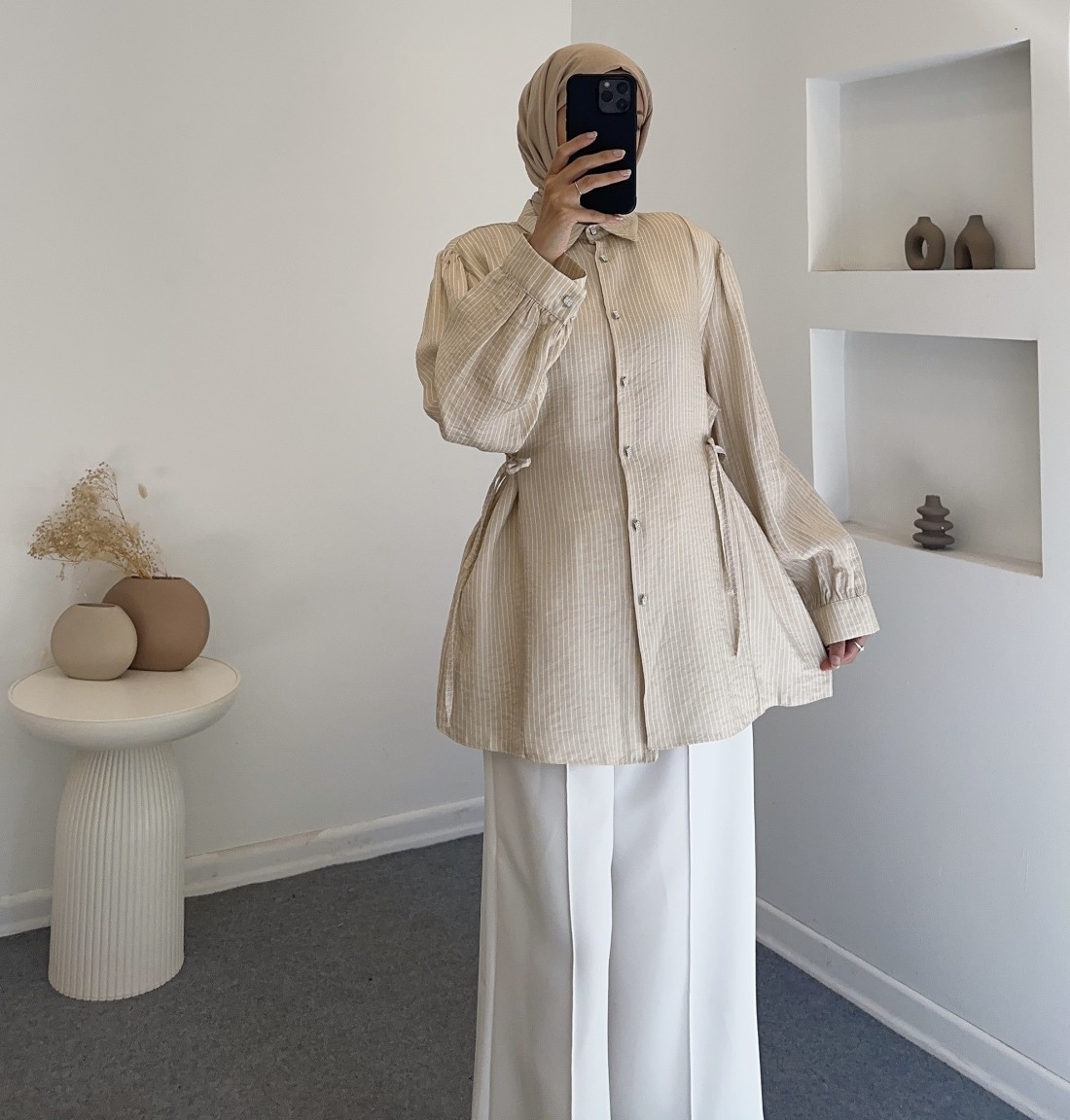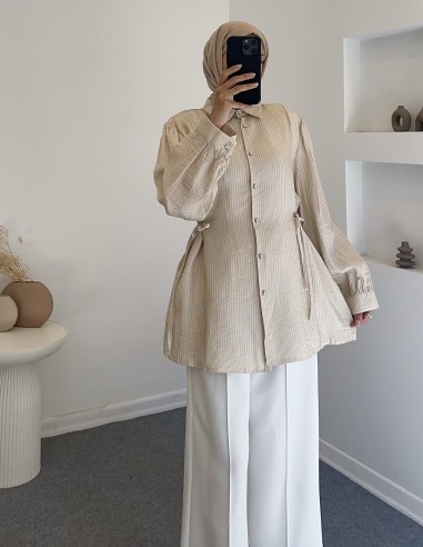 5083 çizgili saten gömlek - bej
