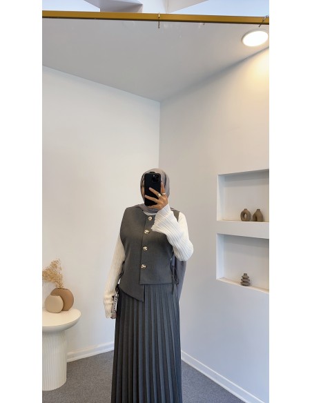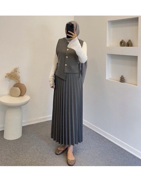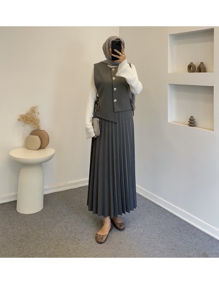 Tunik Asimetrik olarak 50 cm, Yandan Bağlamalı ve Broş düğmelidir. Etek Pilisole formundadır, ortalama 97 cm, oldukça rahattır, Beli Fermuarlıdır.
