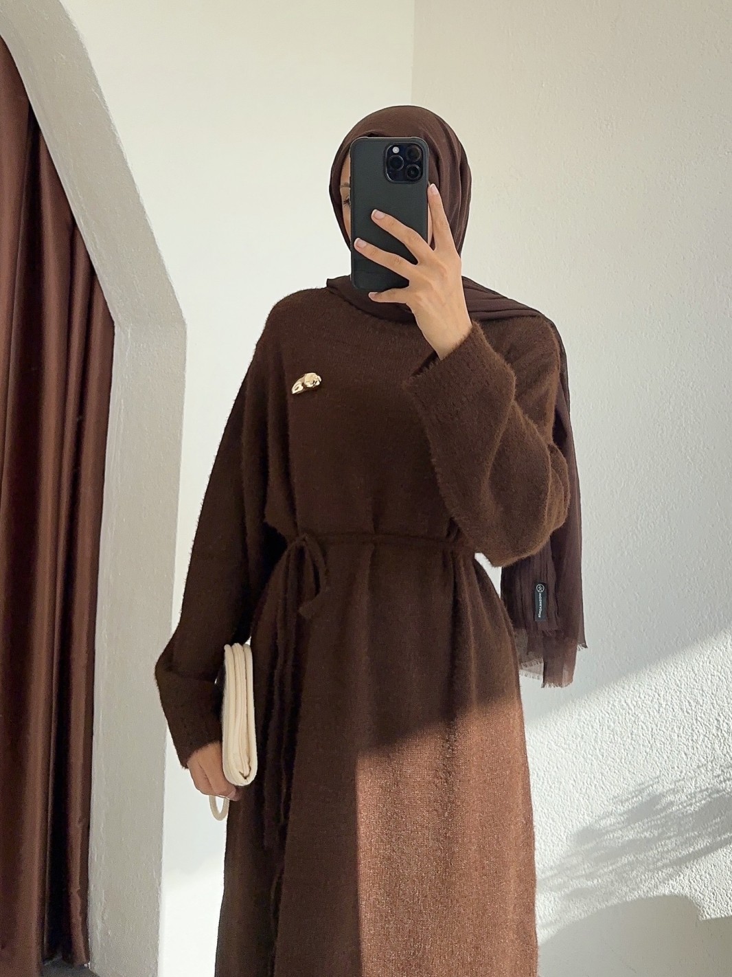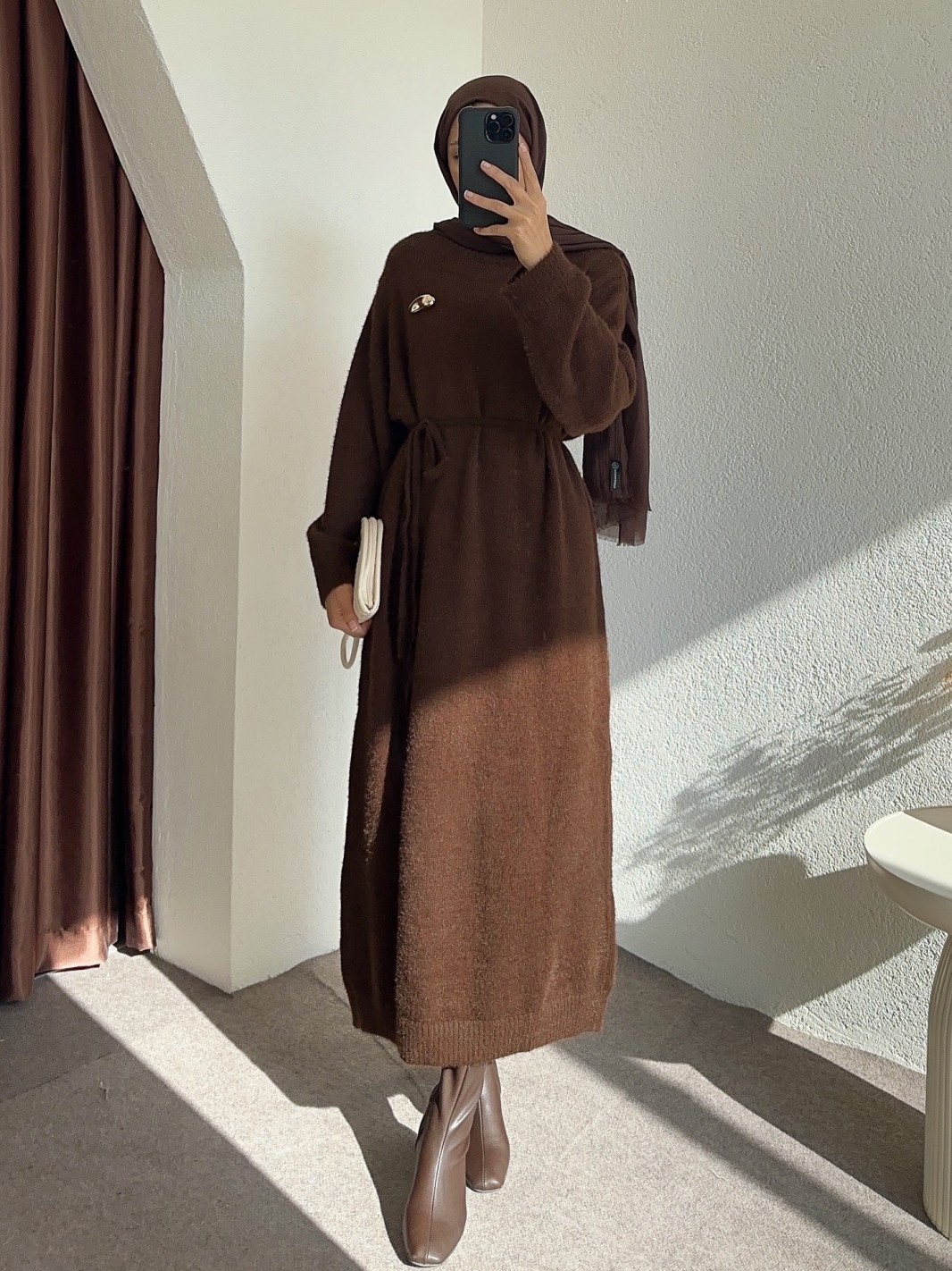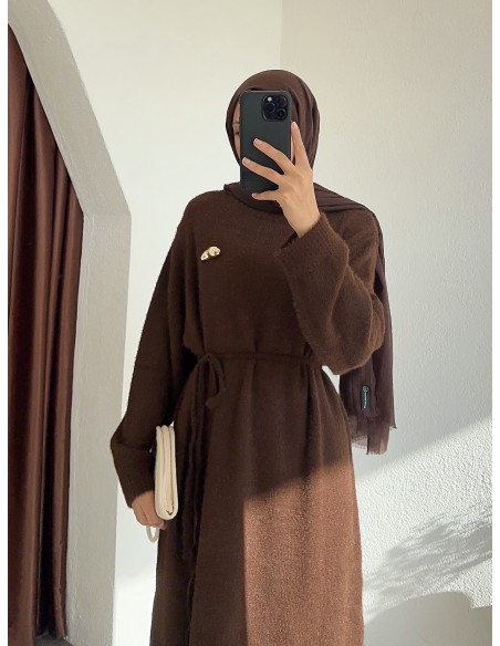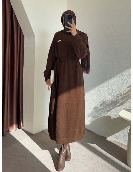 HK26023 broş aksesuarlı elbise - Kahverengi