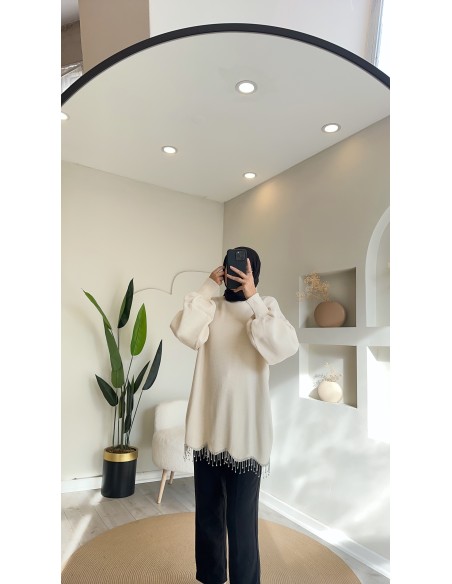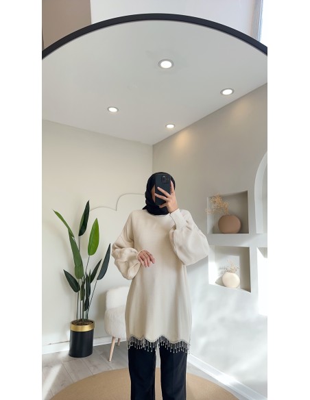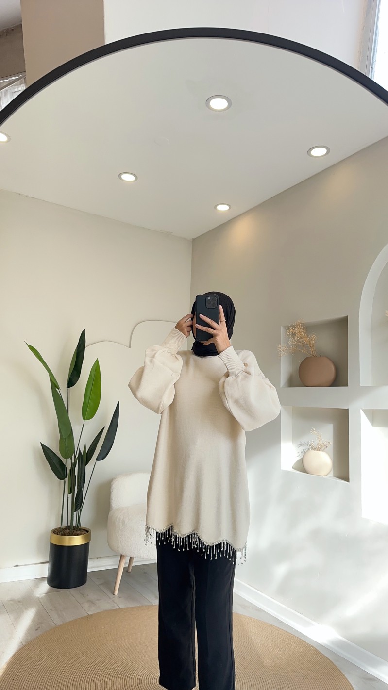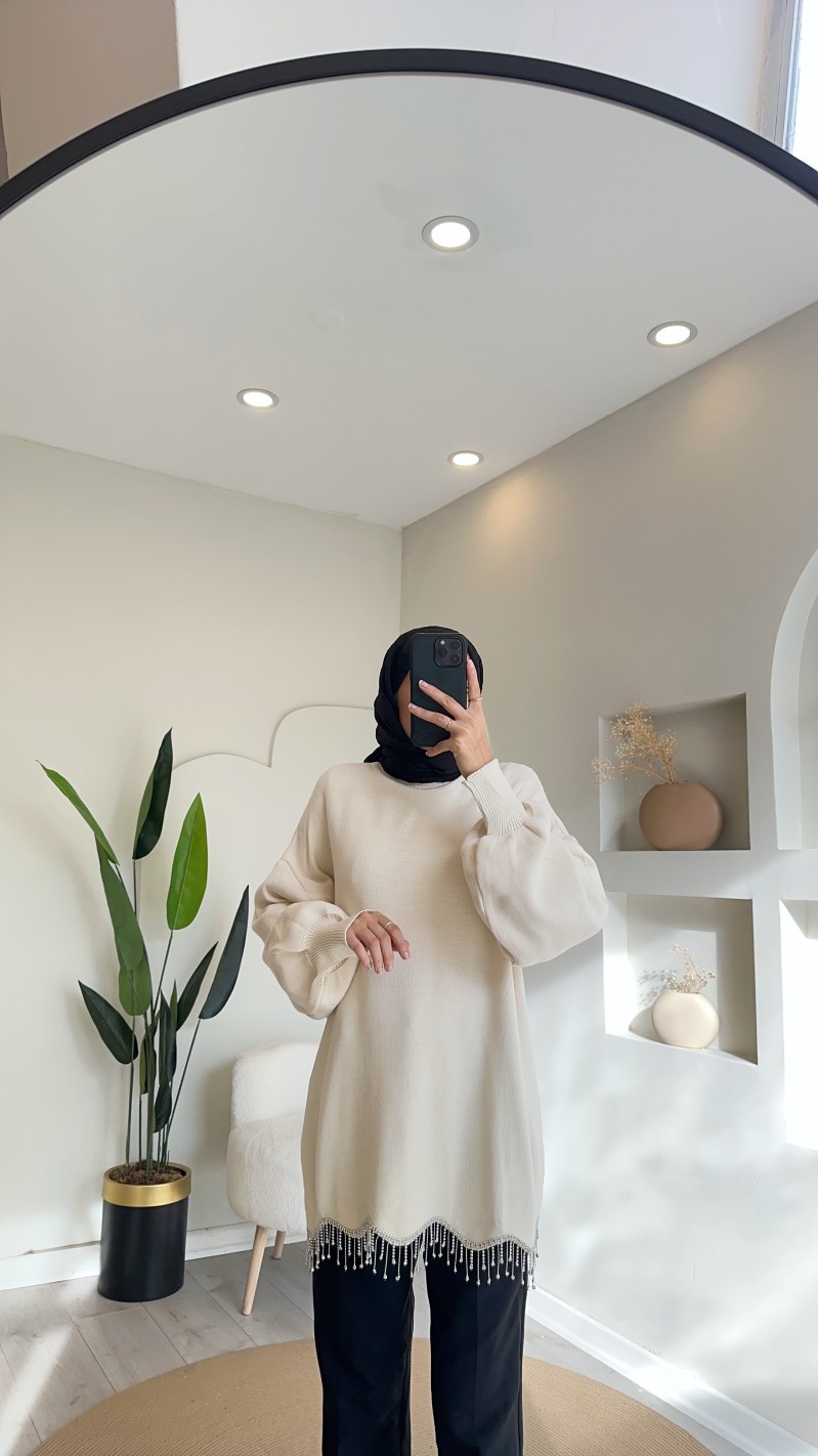 230800 eteği taşlı triko tunik - krem