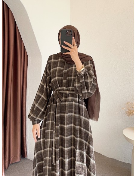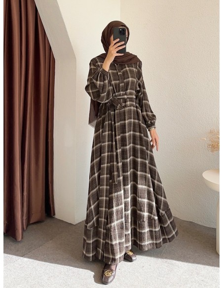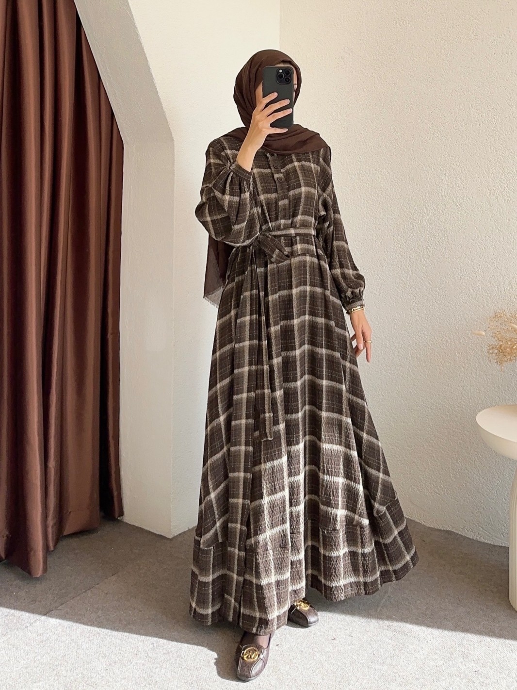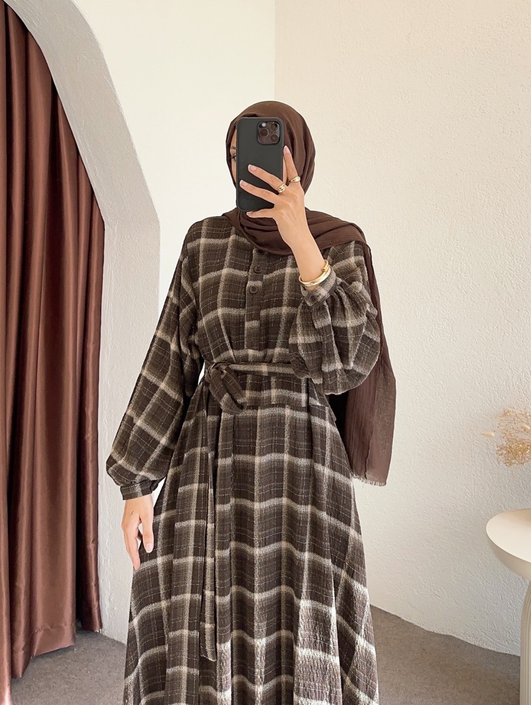 Bisiklet yaka , önden yarım düğmeli , balon kol , manşet kol detaylı , kullanılabilir çift cepli , seyyar kuşaklı elbise .
