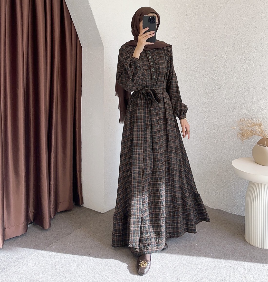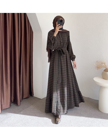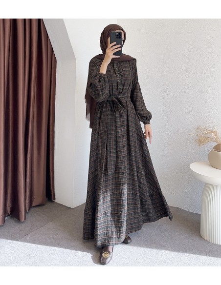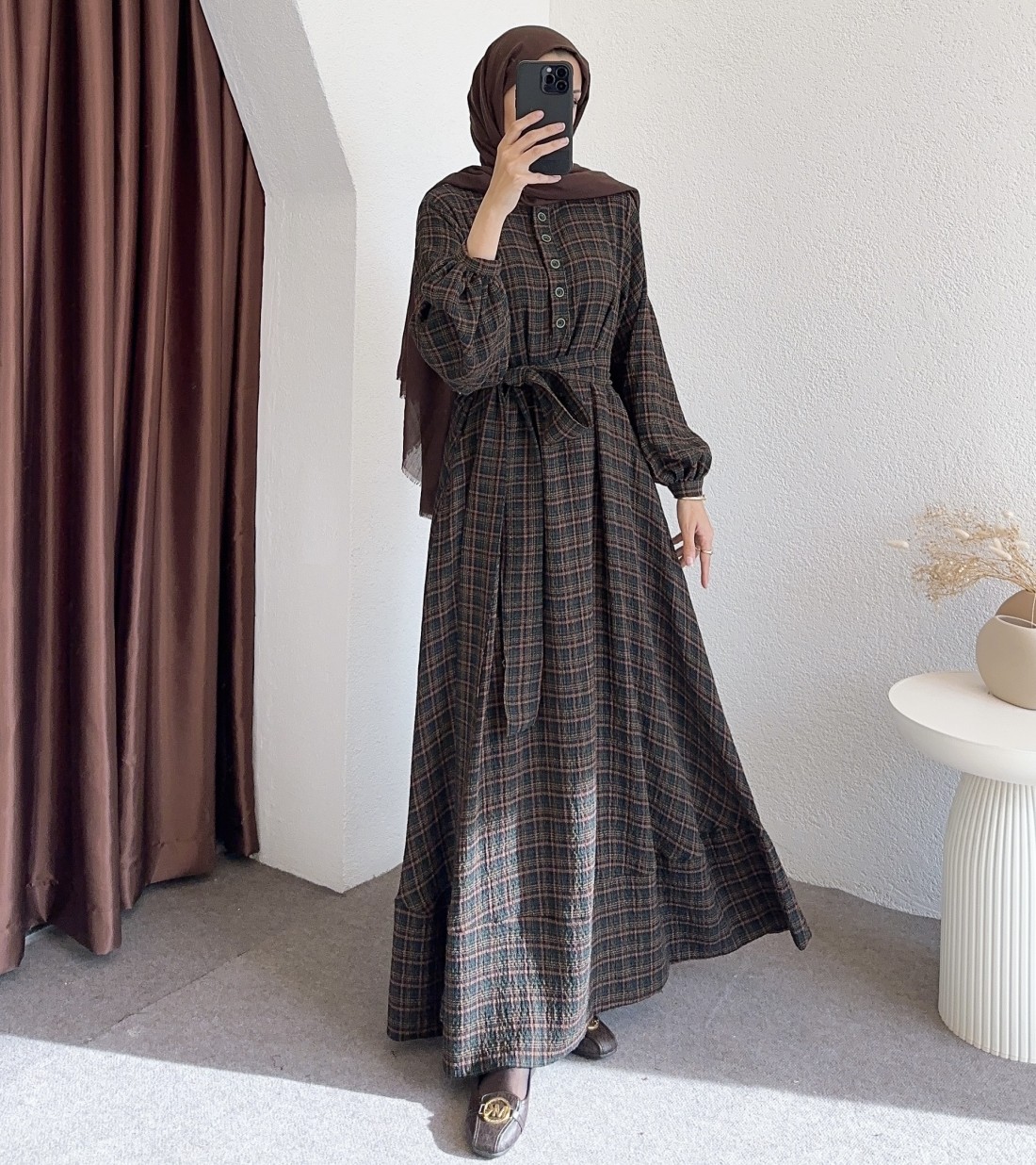 Bisiklet yaka , önden yarım düğmeli , balon kol , manşet kol detaylı , kullanılabilir çift cepli , seyyar kuşaklı elbise .