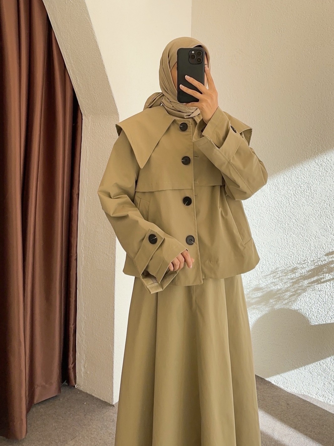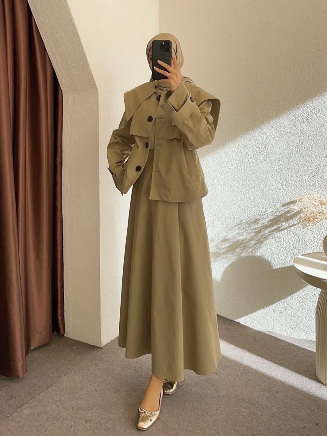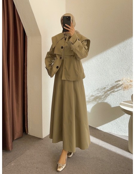 Yüksek bel, arka bel lastikli, fermuar ve kanca kapamalı, pile detaylı, geniş godeli etek, cep detaylı.