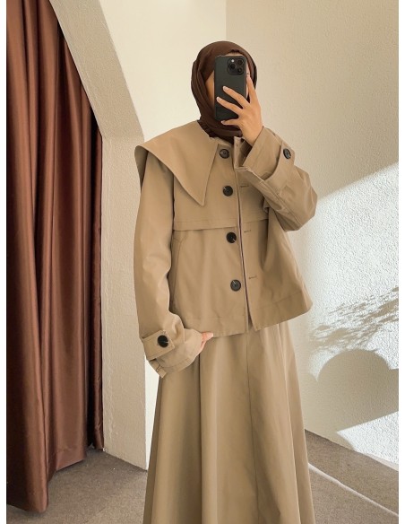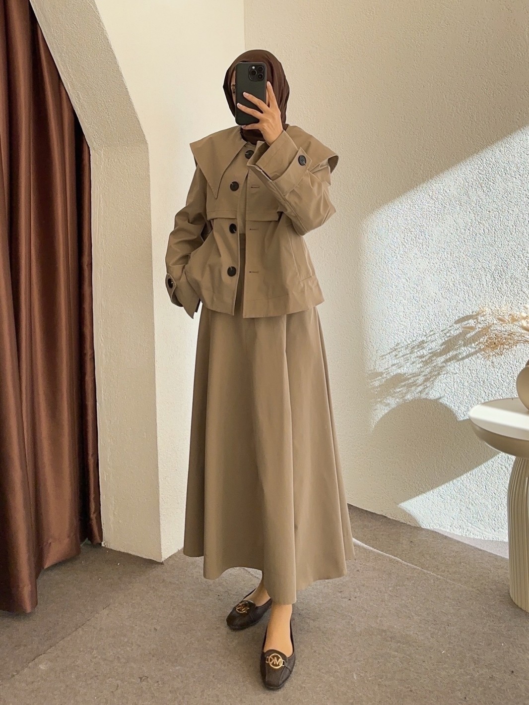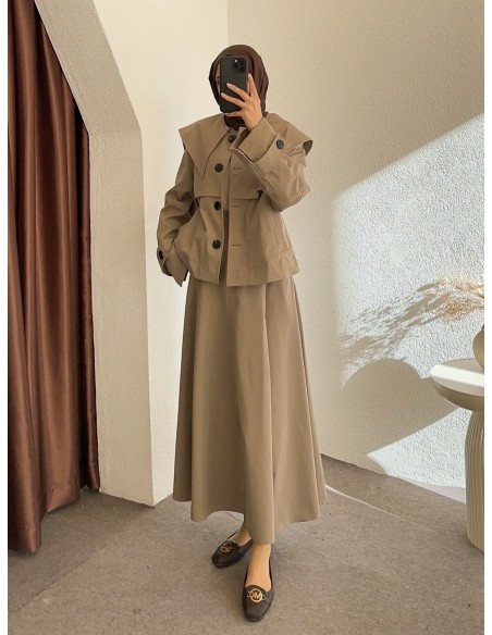 Yüksek bel, arka bel lastikli, fermuar ve kanca kapamalı, pile detaylı, geniş godeli etek, cep detaylı.