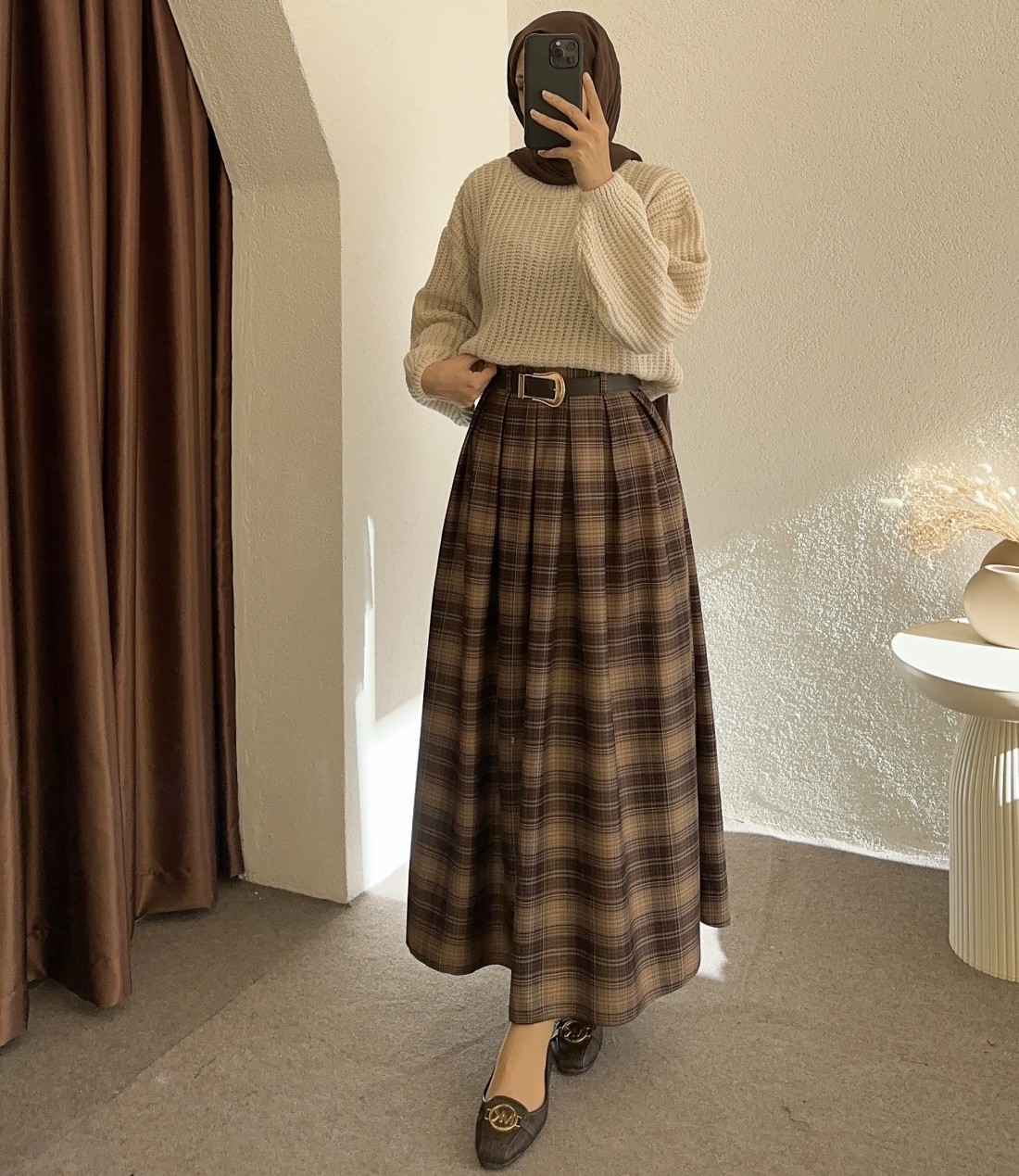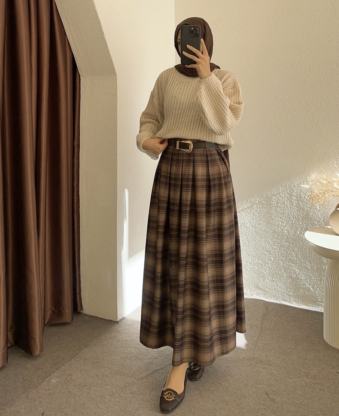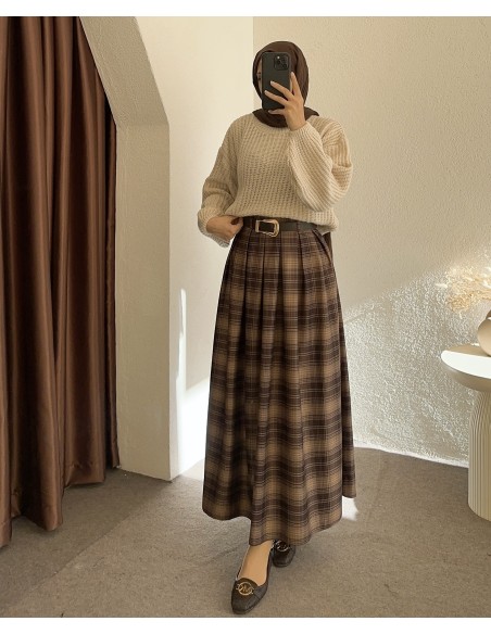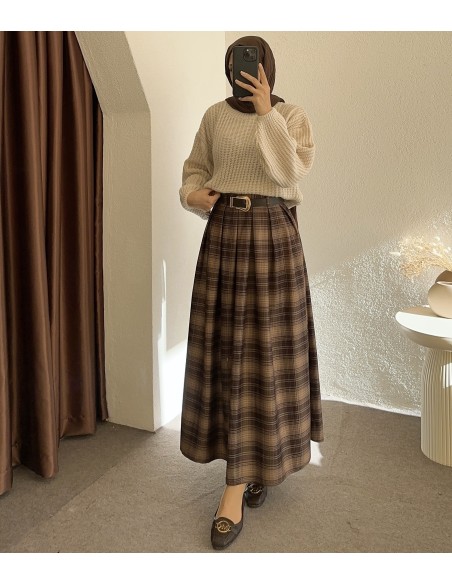 230 kemerli ekose etek -Koyu kahverengi