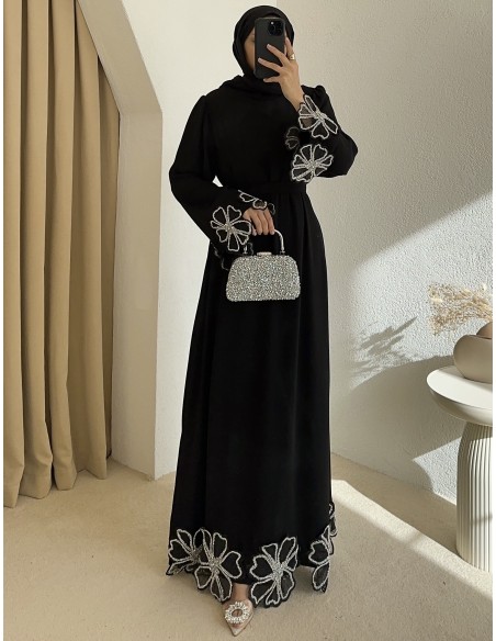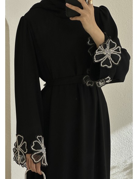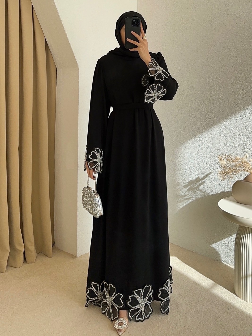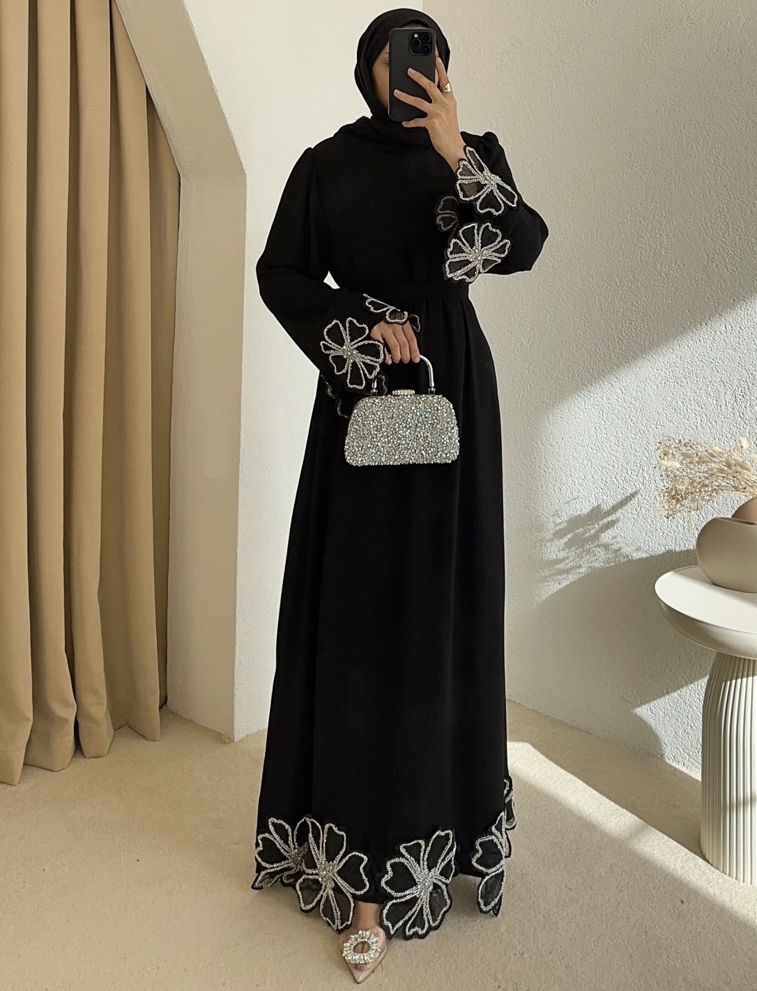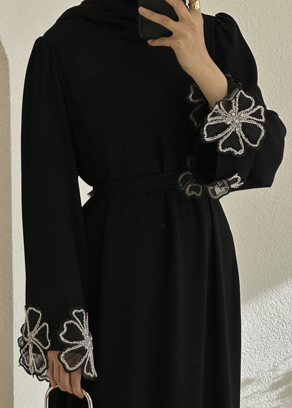 • Detaylar: Kol manşetlerinde ve etek ucunda ışıltılı gümüş çerçeveli çiçek nakış/