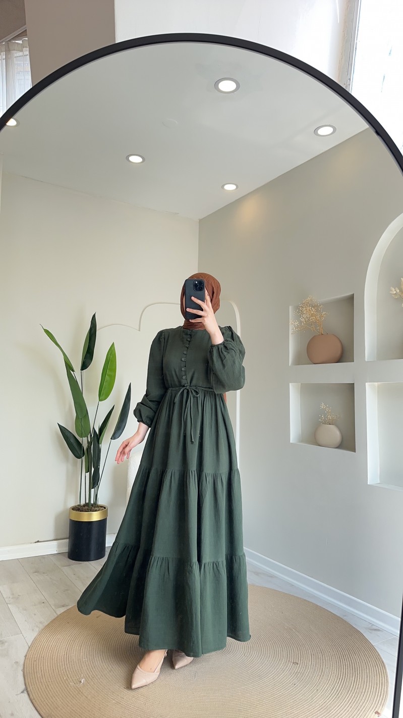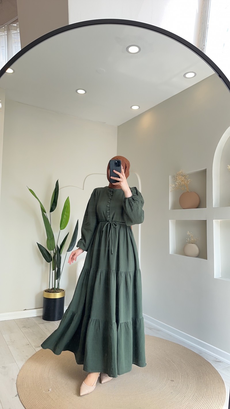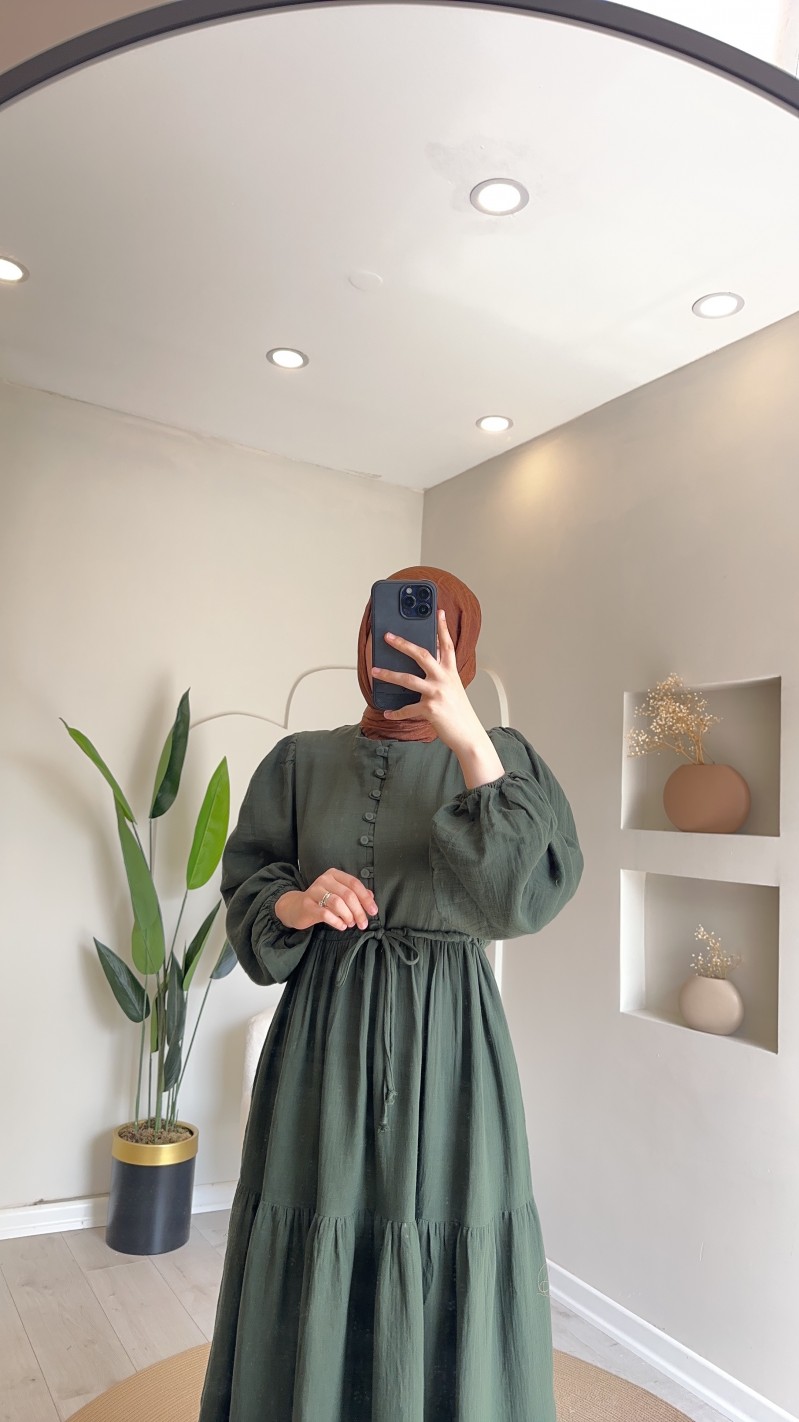 Hy24653 Müslin Düğmeli Elbise Kına Yeşili