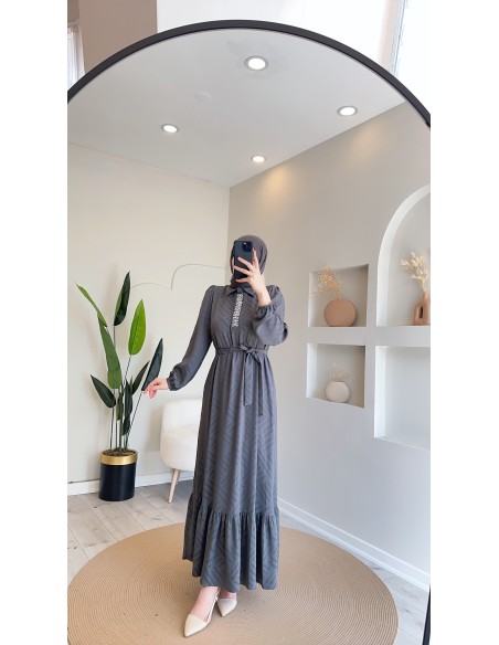 6015 Jakarlı Saten Elbise - Gri